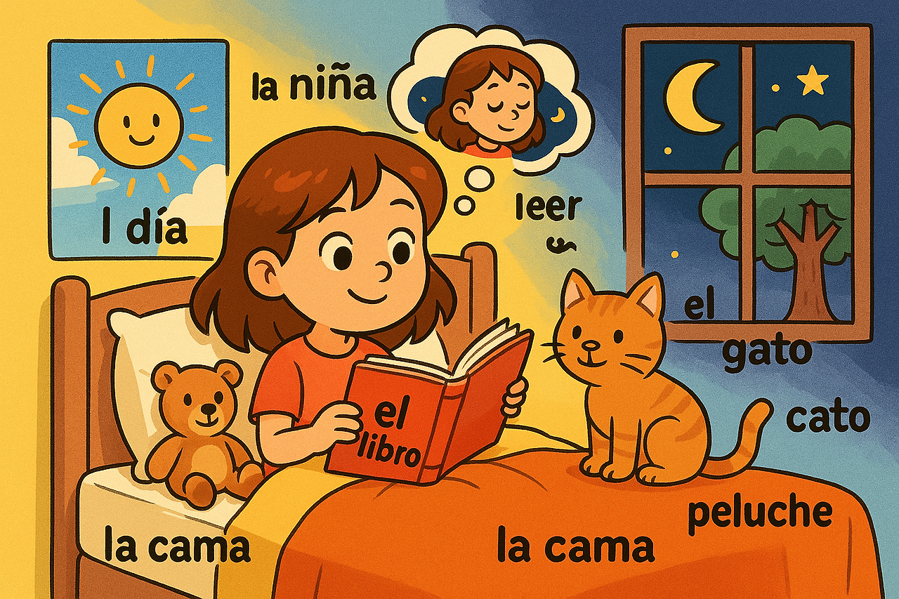 el día 낮, la noche 밤, leer 읽다, soñar 꿈꾸다, el libro 책, la niña 소녀, el árbol 나무, el gato 고양이, el peluche 인형, la cama 침대
