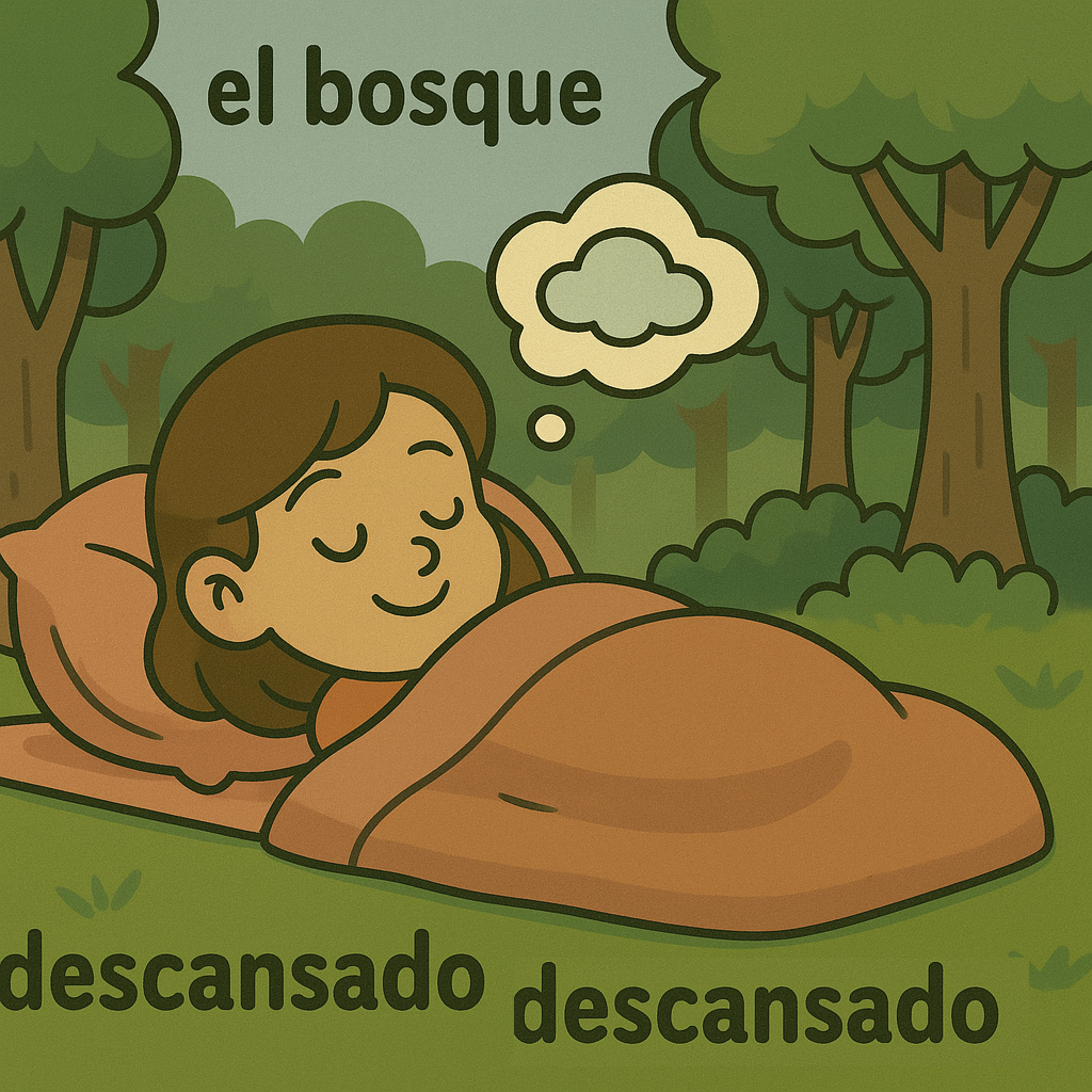 el bosque 숲, el sueño 꿈, descansado 휴식된, relajado 편안한, meterse 들어가다, salir 나가다, pasar 일어나다, sentirse 느끼다, exactamente 정확히, sabés 너는 안다