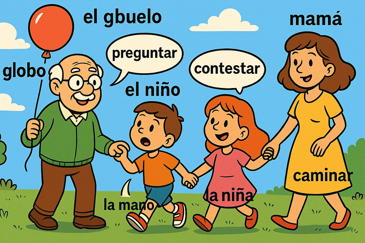 el globo 풍선, el abuelo 할아버지, mandar 보내다, el niño 남자아이, la niña 여자아이, preguntar 묻다, contestar 대답하다, caminar 걷다, el cielo 하늘, la mano 손