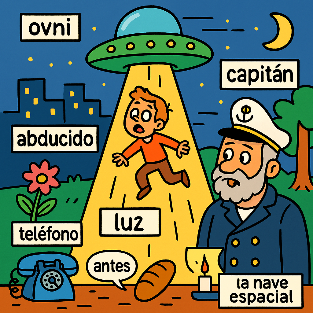 el ovni 엘 오브니, el capitán 엘 까삐딴, abducido 압두씨도, alguien 알기엔, antes 안떼스, la ciudad 라 씨우닷, el teléfono 엘 떼레뽀노, la luz 라 루스, la noche 라 노체, la nave espacial 라 나베 에스빠씨알
