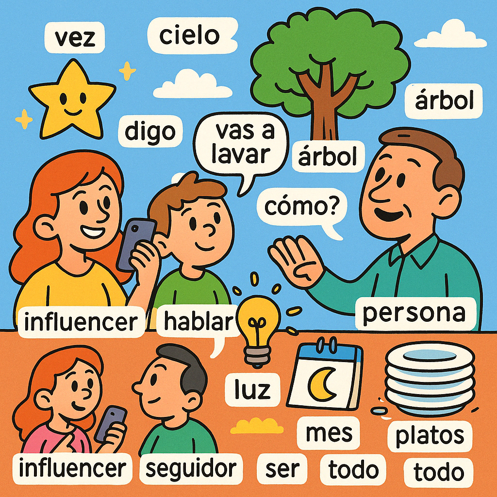 vez 횟수, digo 말하다, tenemos que 우리는 해야 한다, hablar 말하다, algo 무언가, estrella 별, árbol 나무, luz 빛, cielo 하늘, persona 사람