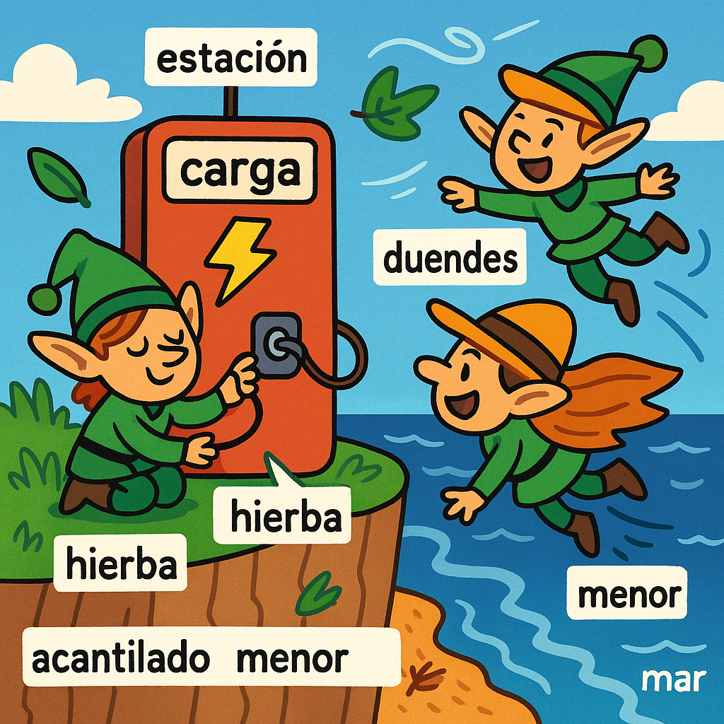 estación 에스타시온, carga 까르가, duendes 두엔데스, hierba 이에르바, acantilado 아깐띨라도, mar 마르, sombrero 솜브레로, viento 비엔또, cola 꼴라, hoja 오하