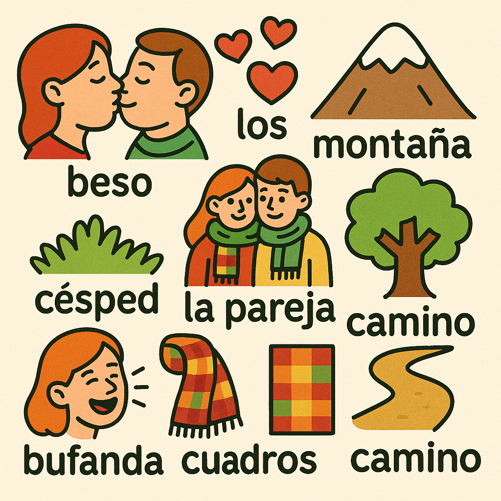 beso 베소, la pareja 라 빠레하, los corazones 로스 코라소네스, montaña 몬타냐, césped 쎄스뻬드, árbol 아르볼, bufanda 부판다, cuadros 꾸아드로스, camino 까미노