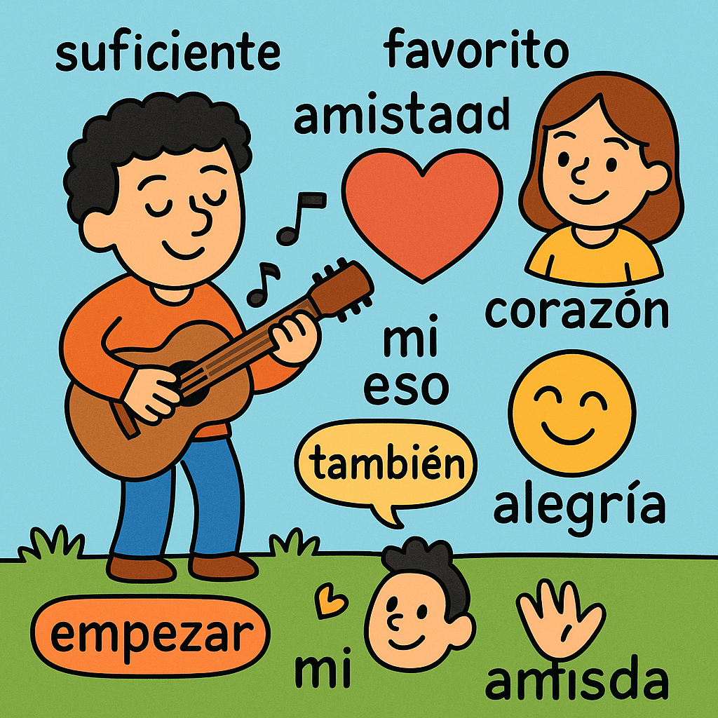 músico 음악가, favorito 가장 좋아하는, amistad 우정, corazón 마음, suficiente 충분한, empezar 시작하다, alegría 기쁨, mi 나의, eso 그것, también 또한