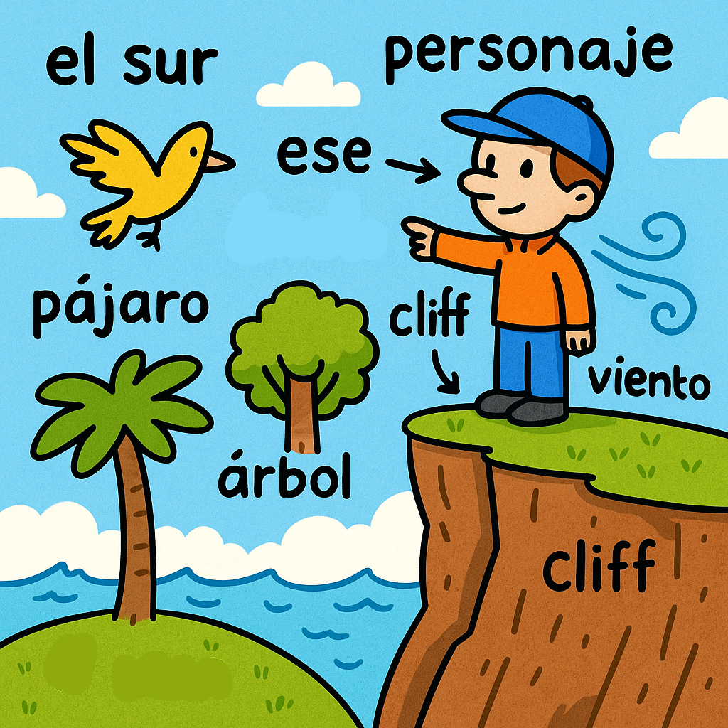 el sur 남쪽, ese 저것, lado 쪽, pájaro 새, árbol 나무, personaje 등장인물, dirección 방향, gorra 모자, acantilado 절벽, viento 바람