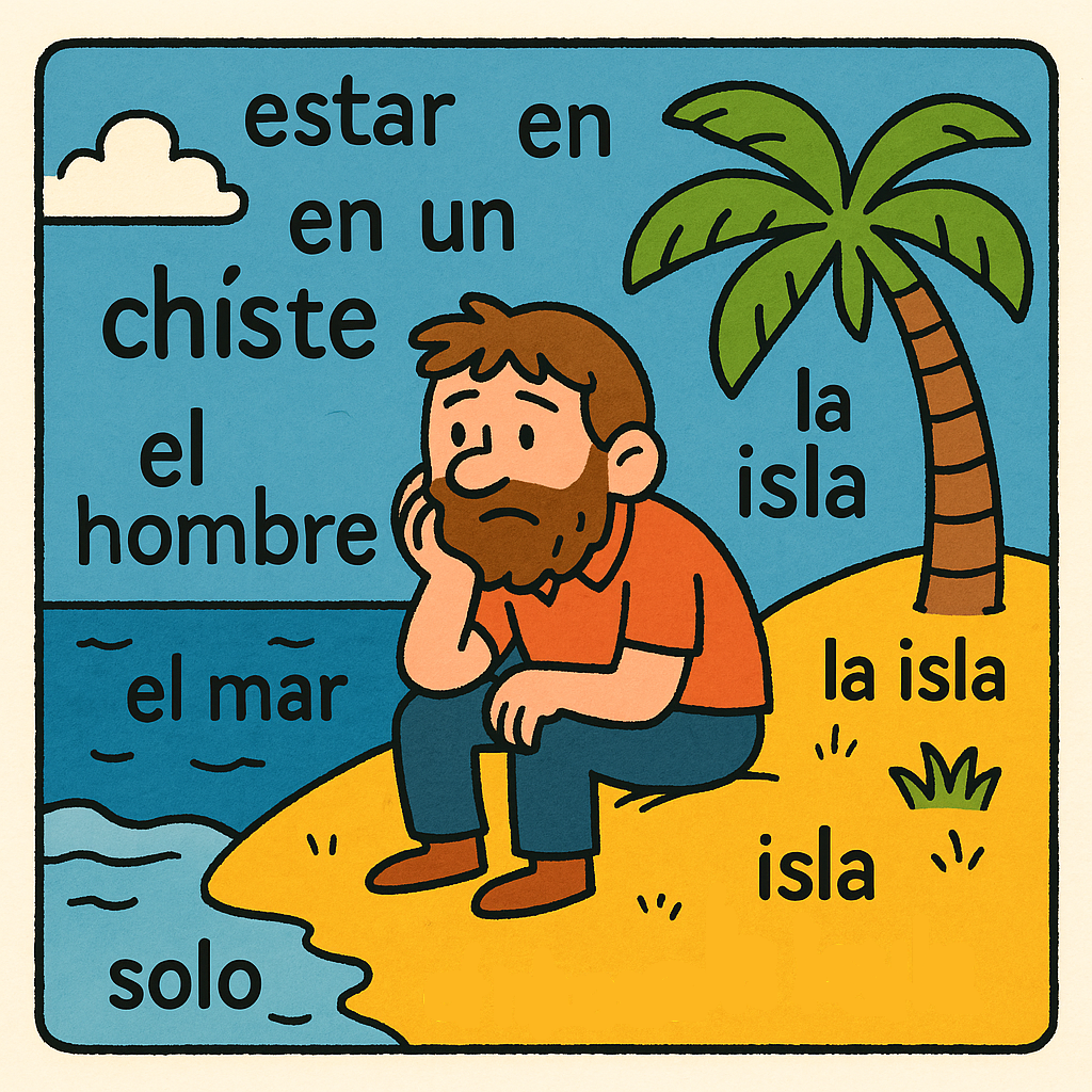 debo 데보, estar 에스따르, en 엔, un 운, chiste 치스떼, la isla 라 이슬라, el hombre 엘 옴브레, el mar 엘 마르, la palma 라 빨마, solo 쏠로