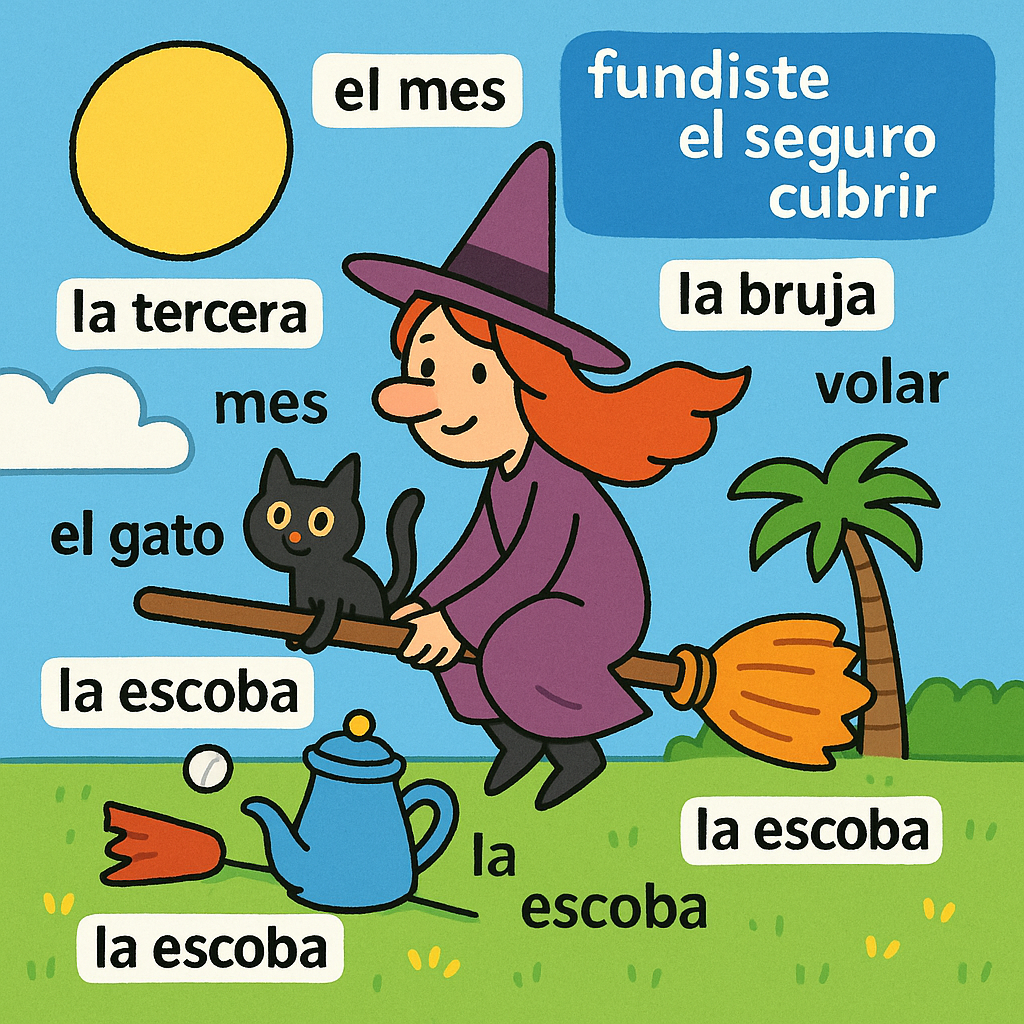 el seguro 보험, cubrir 덮다, la tercera 세 번째, la escoba 빗자루, fundiste 녹였다, mes 달, el gato 고양이, la bruja 마녀, volar 날다, la pradera 초원