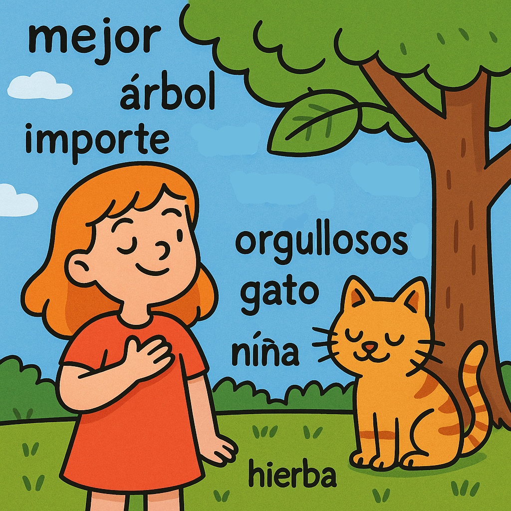 mejor 더 나은, nadie 아무도, importe 중요하다, orgullosos 자랑스러운, árbol 나무, niña 소녀, gato 고양이, hoja 잎, hierba 풀