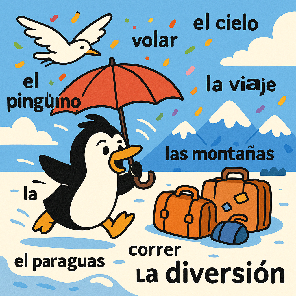 el pingüino 펭귄, el paraguas 우산, volar 날다, el viaje 여행, el equipaje 가방, el cielo 하늘, correr 달리다, las montañas 산들, la nieve 눈, la diversión 즐거움