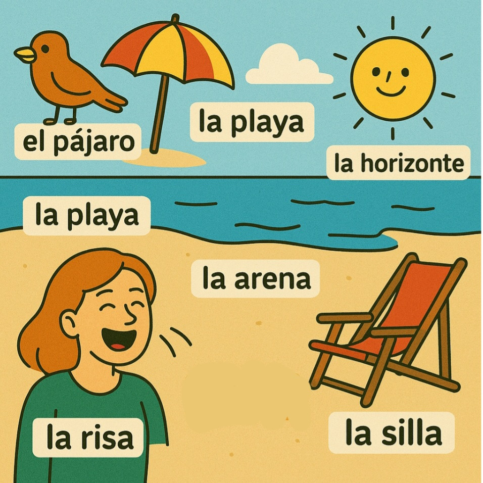 el pájaro 엘 빠하로, la playa 라 쁠라야, el mar 엘 마르, el paraguas 엘 빠라구아스, la arena 라 아레나, la risa 라 리사, el sol 엘 솔, el horizonte 엘 오리손떼, el humor 엘 우모르, la silla 라 시야