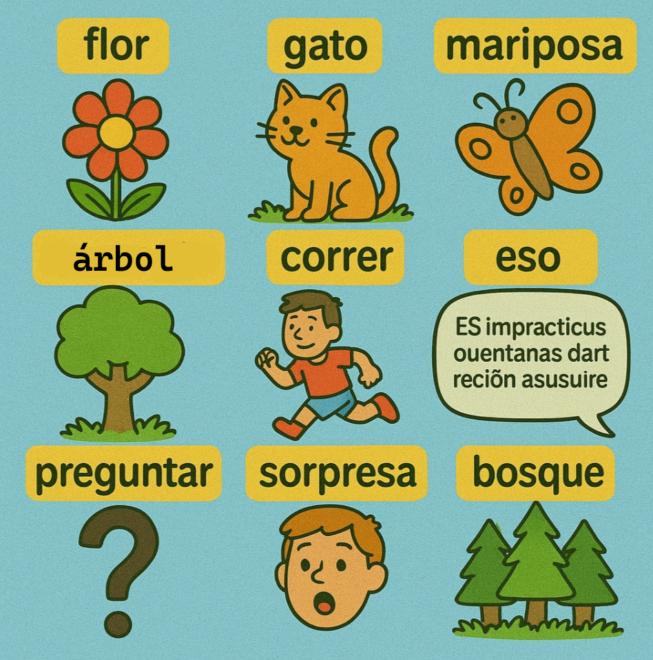 flor 플로르, gato 가또, mariposa 마리뽀사, árbol 아르볼, césped 세스페드, correr 꼬레르, parar 빠라르, preguntar 프레군따르, sorpresa 소르쁘레사, bosque 보스께
