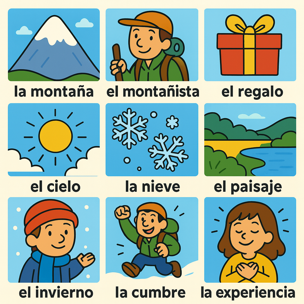 la montaña 라 몬따냐, el montañista 엘 몬따니스타, el regalo 엘 레갈로, el cielo 엘 씨에로, la nieve 라 니에베, el paisaje 엘 빠이사헤, el invierno 엘 인비에르노, la cumbre 라 쿰브레, la emoción 라 에모씨온, la experiencia 라 엑스뻬리엔씨아
