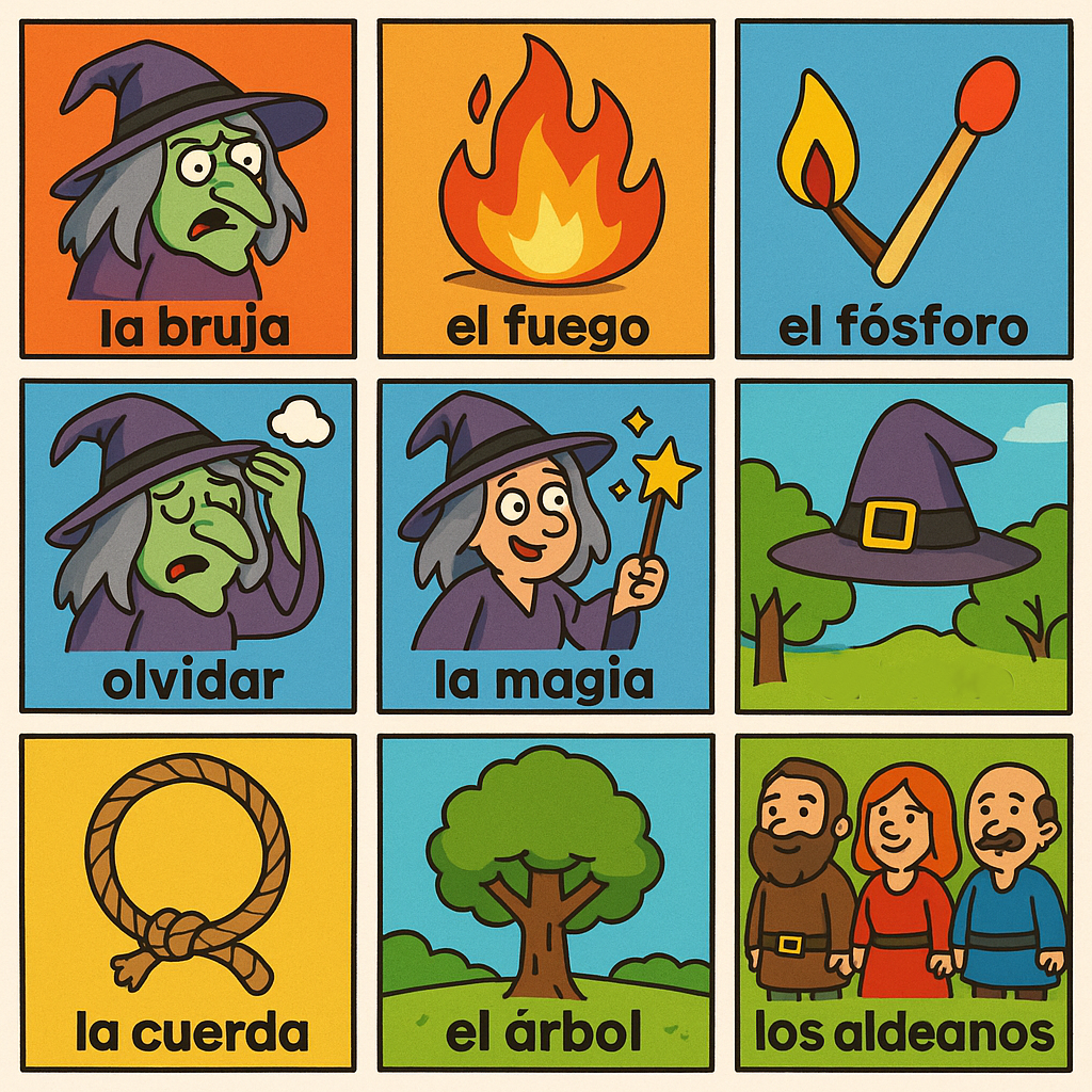la bruja 라 브루하, el fuego 엘 푸에고, el fósforo 엘 포스포로, olvidar 올비다르, la magia 라 마히아, el sombrero 엘 솜브레로, la cuerda 라 꾸에르다, el árbol 엘 아르볼, los aldeanos 로스 알데아노스, la hoguera 라 오게라