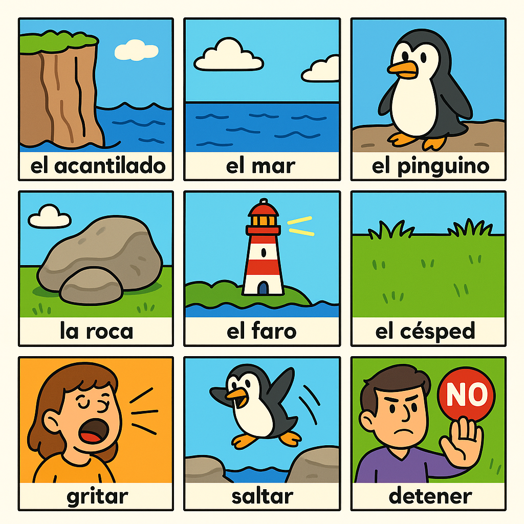 el acantilado 엘 아깐띨라도, el mar 엘 마르, el pingüino 엘 핑귀노, la roca 라 로까, el faro 엘 파로, el césped 엘 쎄스뻬드, gritar 그리따르, saltar 살따르, no 노, detener 데떼네르