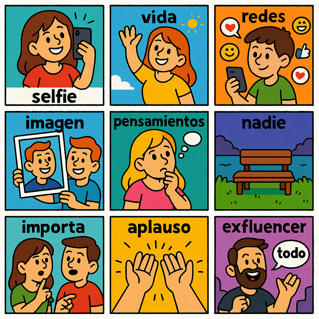 selfie 셀피에, vida 비다, redes sociales 레데스 소시아레스, imagen 이마헨, pensamientos 뻰사미엔또스, nadie 나디에, importa 임뽀르따, aplauso 아뿔라우소, exfluencer 엑스플루엔세르, todo 또도