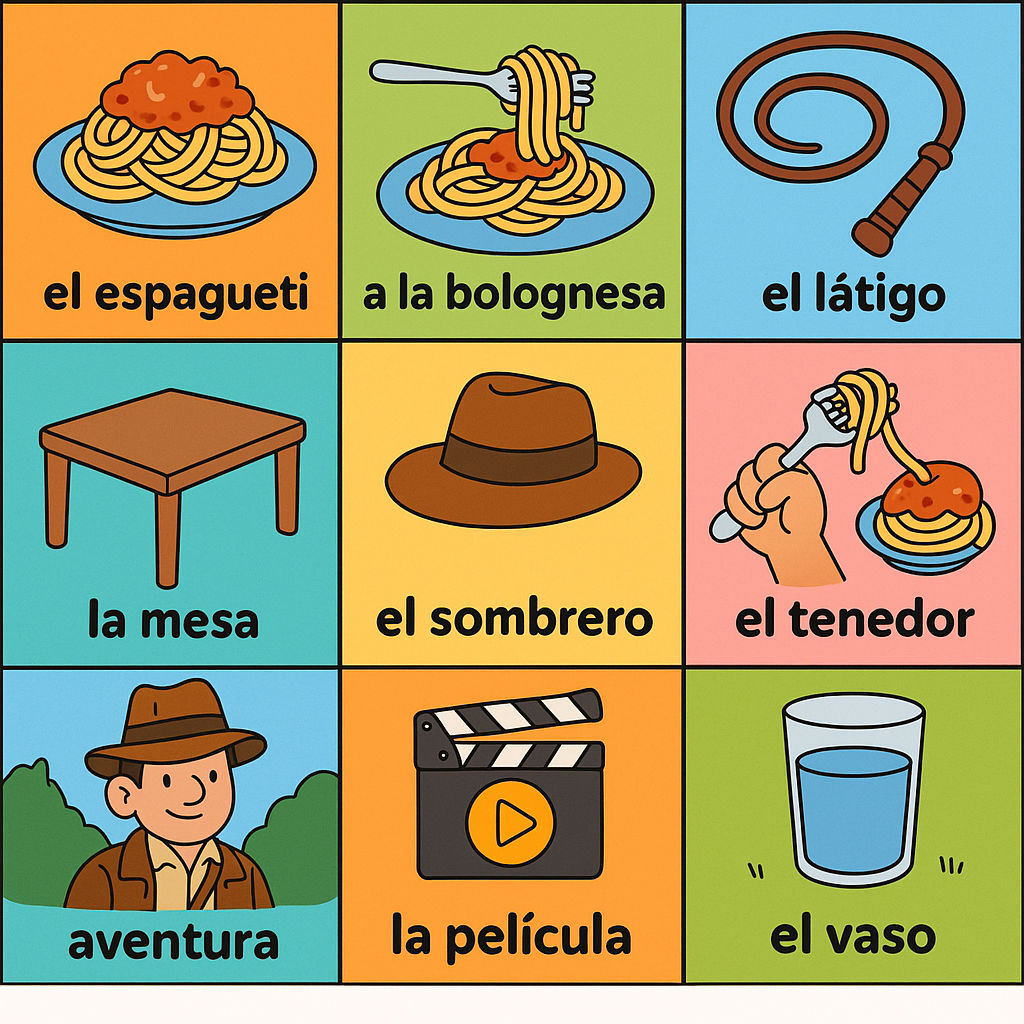 Indiana Jones 인디아나 존쓰, el espagueti 엘 에스빠게띠, a la bolognesa 아 라 볼로네싸, el látigo 엘 라띠고, la mesa 라 메싸, el sombrero 엘 솜브레로, el tenedor 엘 떼네도르, aventura 아벤뚜라, la película 라 뻴리꿀라, el vaso 엘 바소