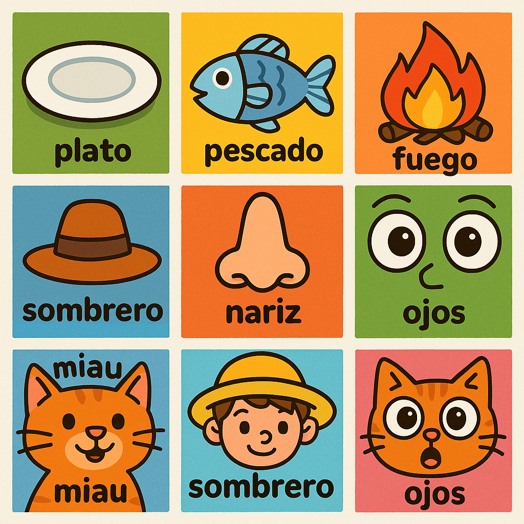bruja 브루하, gato 가또, plato 쁠라또, pescado 뻬스까도, fuego 푸에고, sombrero 솜브레로, nariz 나리즈, ojos 오호스, monstruo 몬스트루오, miau 미아우