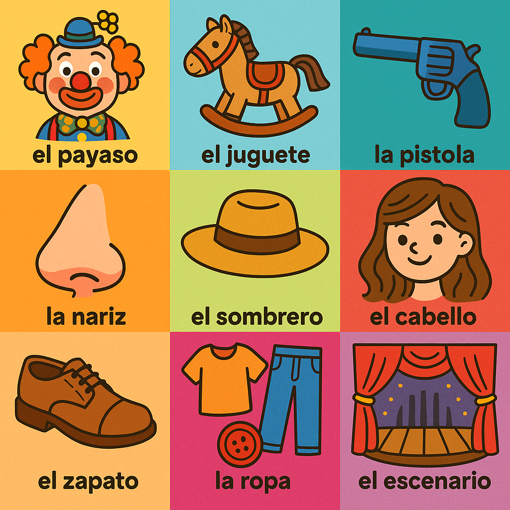 el payaso 엘 빠야소, el juguete 엘 후게떼, la pistola 라 삐스똘라, la nariz 라 나리스, el sombrero 엘 솜브레로, el cabello 엘 까베요, el zapato 엘 싸빠또, la ropa 라 로빠, el botón 엘 보똔, el escenario 엘 에스세나리오