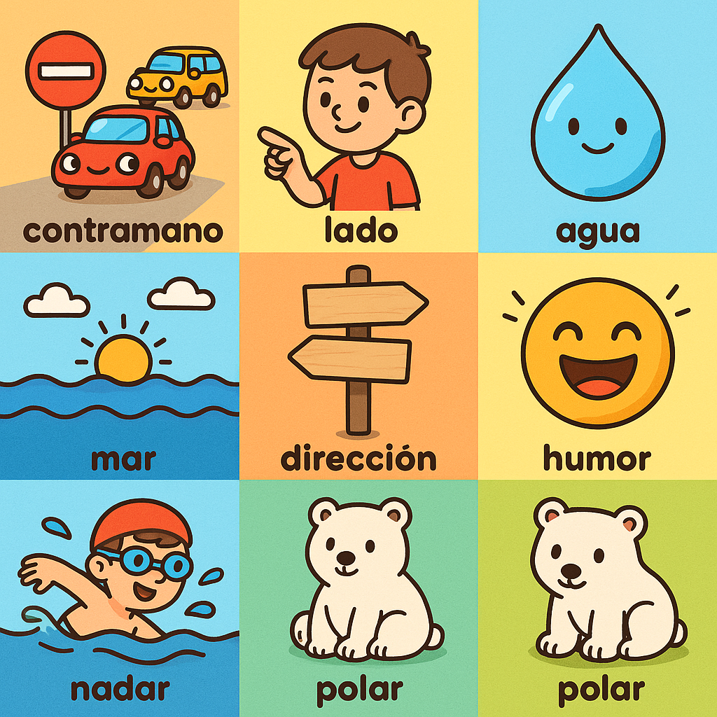 pingüino 핑귀노, ola 올라, contramano 콘트라마노, lado 라도, agua 아구아, mar 마르, dirección 디렉시온, humor 우모르, nadar 나다르, polar 뽈라르