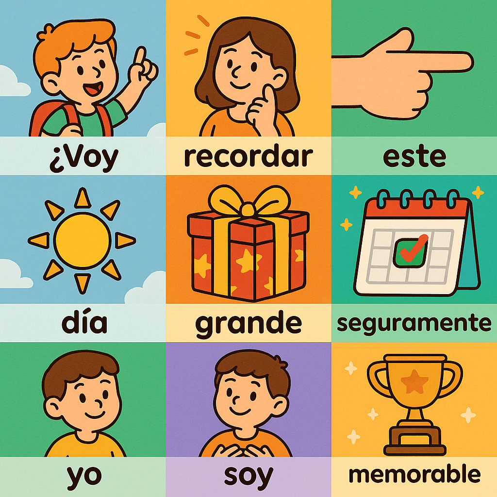¿Voy~ 보이, recordar 레꼬르다르, este 에스떼, día 디아, grande 그란데, seguramente 세구라멘떼, yo 요, soy 소이, bastante 바스딴떼, memorable 메모라블레