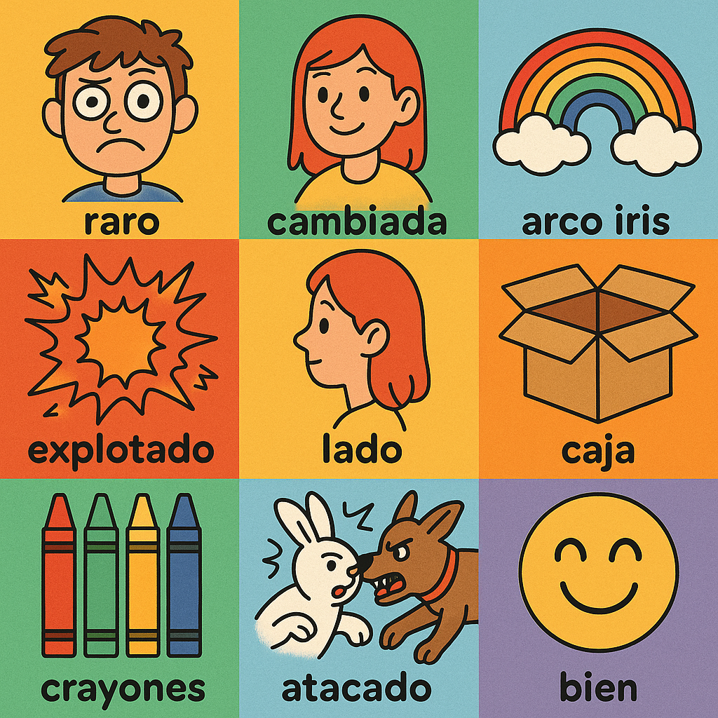 raro 이상한, cambiada 변한, arco iris 무지개, explotado 폭발한, lado 옆, caja 상자, crayones 크레용, atacado 공격한, bastante 꽤, bien 잘