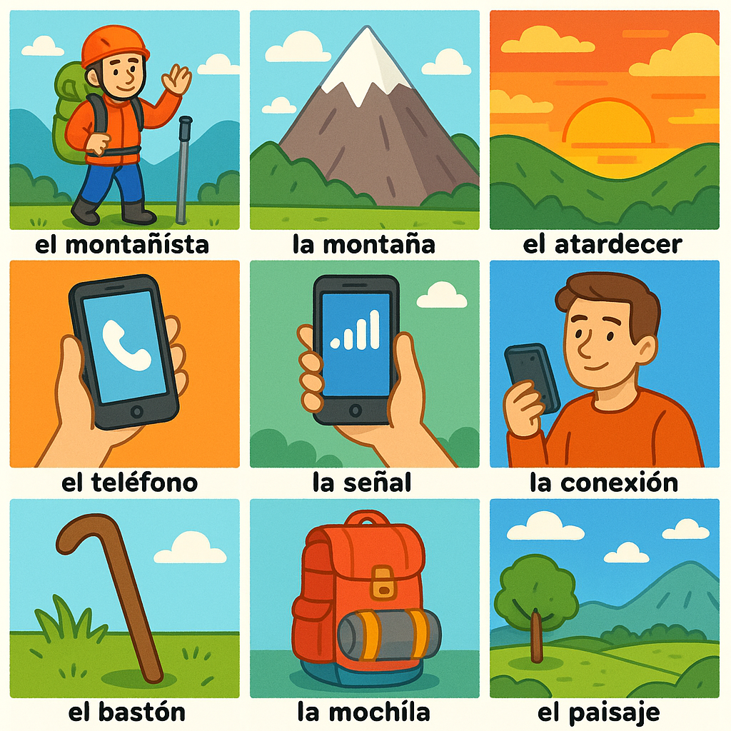 el montañista 엘 몬타니스타, la montaña 라 몬타냐, el atardecer 엘 아따르데쎄르, el teléfono 엘 떼레포노, la señal 라 세냘, la conexión 라 꼬넥씨옹, el bastón 엘 바스똔, la mochila 라 모칠라, el paisaje 엘 빠이싸헤, el cielo 엘 씨엘로