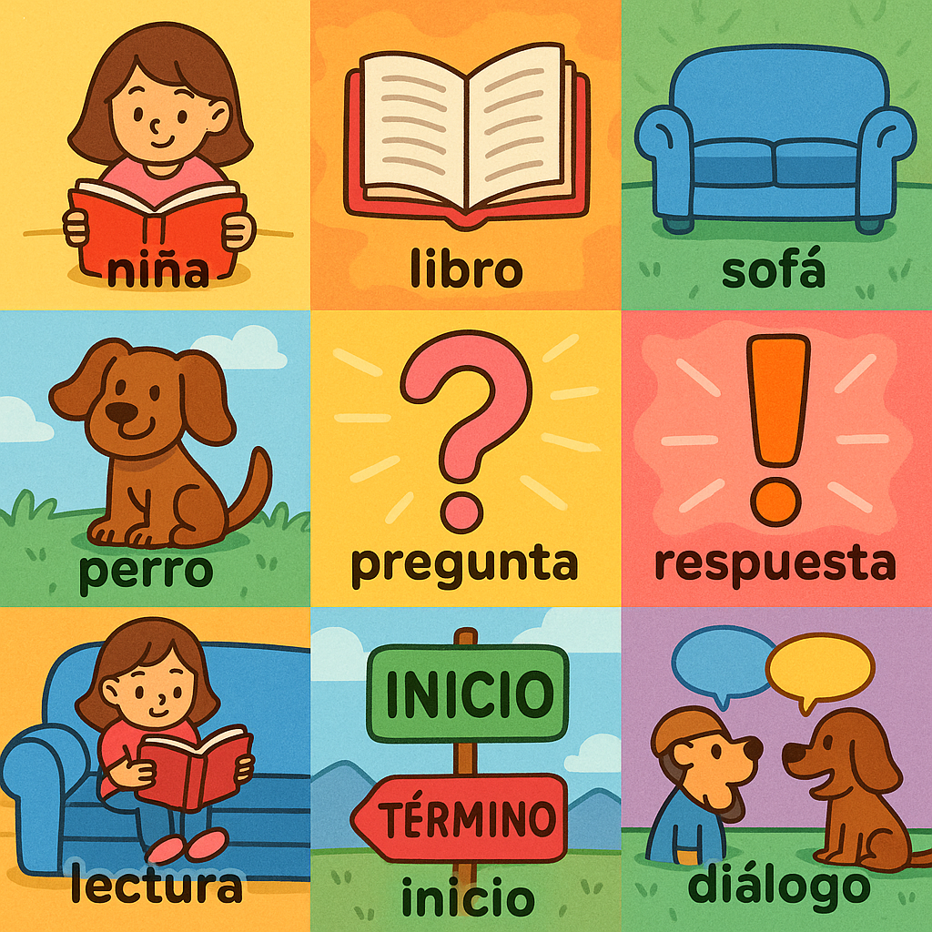 niña 소녀, libro 책, sofá 소파, perro 개, pregunta 질문, respuesta 대답, lectura 독서, inicio 시작, termino 끝, diálogo 대화