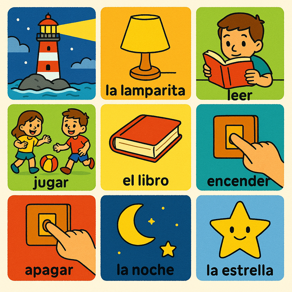 el faro 엘 파로, la lamparita 라 람빠리따, leer 레에르, jugar 후가르, el libro 엘 리브로, encender 엔센데르, apagar 아빠가르, la noche 라 노체, el cielo 엘 씨엘로, la estrella 라 에스뜨레야
