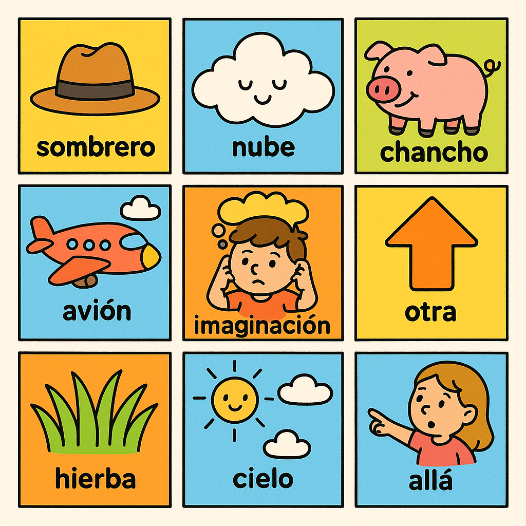 sombrero 솜브레로, nube 누베, chancho 찬초, avión 아비온, imaginación 이마히나시온, otra 오뜨라, hierba 이에르바, cielo 씨엘로, allá 아야