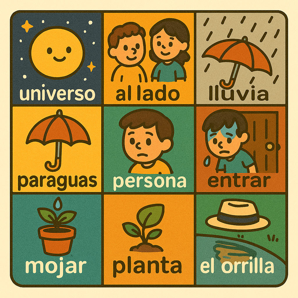 universo 우니베르소, al lado 알 라도, lluvia 유비아, paraguas 빠라구아스, persona 뻬르소나, entrar 엔뜨라르, mojar 모하르, planta 쁠란따, sombrero 솜브레로, puerta 뿌에르따